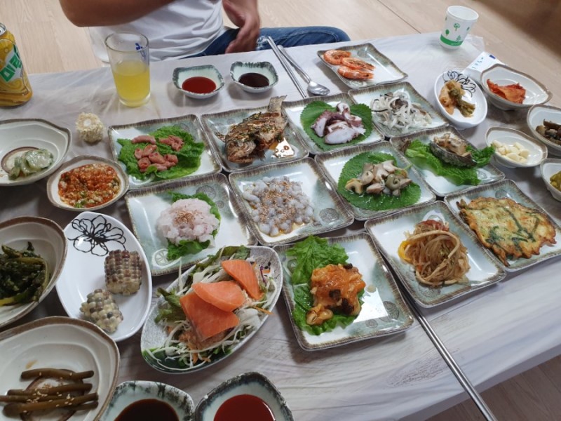 이게 한상차림입니다. 튀김이나 탕도 나오지만, 해물을 먹으러 간곳에는 해물이 많이 나와야 좋은 것이겠지요. 정말 상다리 휘어지게 채워주는 인심이 끝장입니다. 고흥의 풍성한 해산물을 드셔보고 싶으시다면 수정횟집을 추천드립니다.