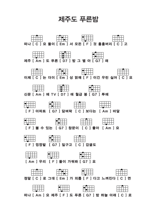 제주도 하면 떠오르는 노래 중 하나인 `제주도 푸른 밤`입니다. 이 노래는 1988년 발표된 가수 최성원씨의 곡으로 당시 많은 사랑을 받았던 명곡이죠. 지금까지도 꾸준히 리메이크 되고 있으며 최근에는 효리네 민박에서도 등장해서 화제가 되기도 했습니다. 저 또한 여행지에서 자주 듣는 노래이기도 한데요, 이번 기회에 같이 배워보도록 하겠습니다.